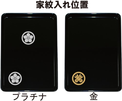 特に黒塗りの切手盆に銀色(プラチナ)の家紋を入れると、落ち着いた雰囲気の中にも品格が漂い、法事・法要にふさわしい仕上がりになります。