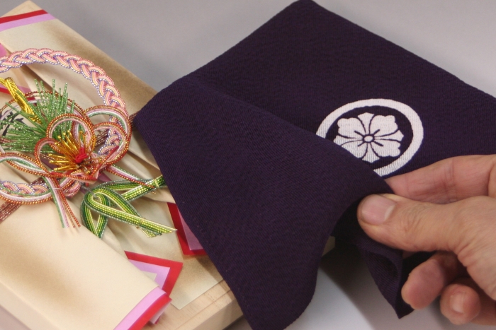 家紋入りの袱紗で結納金やお支度金を渡す
