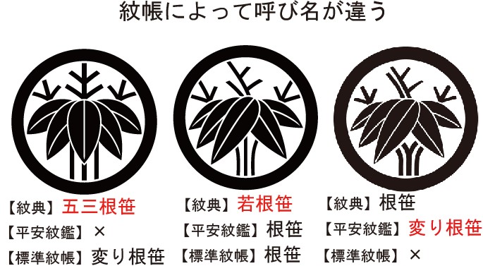 「丸に根笹」は定紋にはないため別注対応となり別途型代が発生しております。この「根笹」という家紋は、以下のように紋帳によって呼び名が違っており、注意が必要です。