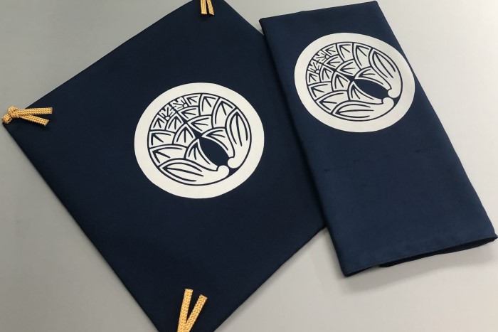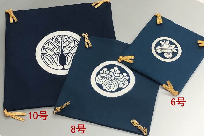15号サイズに最適な大きさの掛袱紗と風呂敷のご注文を頂きました。家紋は「丸に抱き茗荷」色は鉄紺ですが少し落ち着いた色目に染めさせていただきました。広蓋15号に合わせる際、以下の組み合わせがバランス良くおすすめです